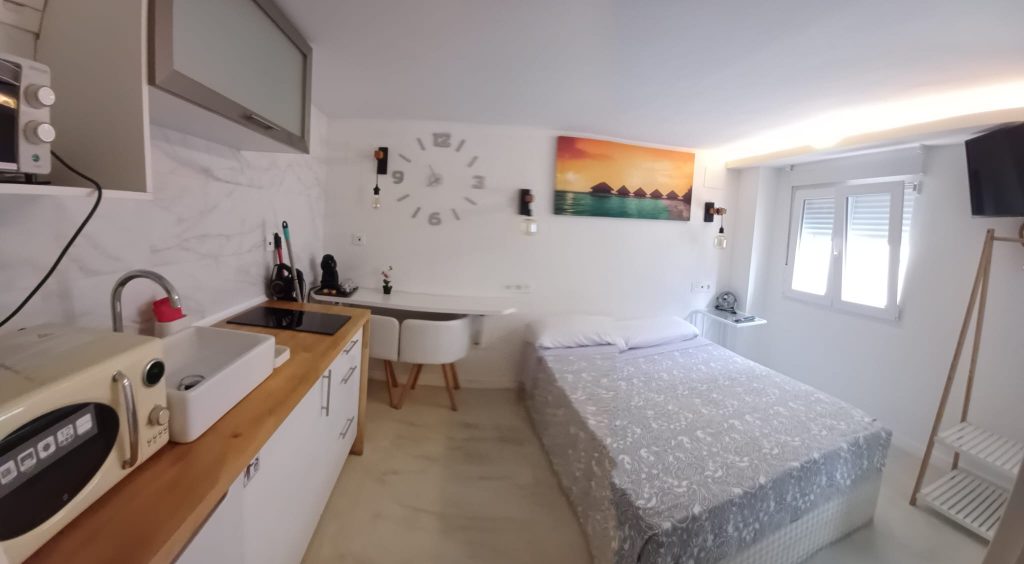 Cada alojamiento dispone de 1 cama doble de 150cm, perchero, cocina totalmente equipada con nevera, microondas, cafetera Nescafe Dulce Gusto, horno tostador, TV de pantalla plana, Mesa de comedor y baño privado con bidet y ducha shampoo (gratis).